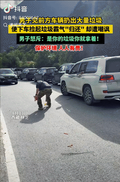 丢人丢大发了!西藏林芝,一男子见前车在随地扔垃圾,便下车捡起垃圾霸气“归还”,不料,却遭到前车司机的嘲讽,然而,男子接下来的做法,却没有惯着她!